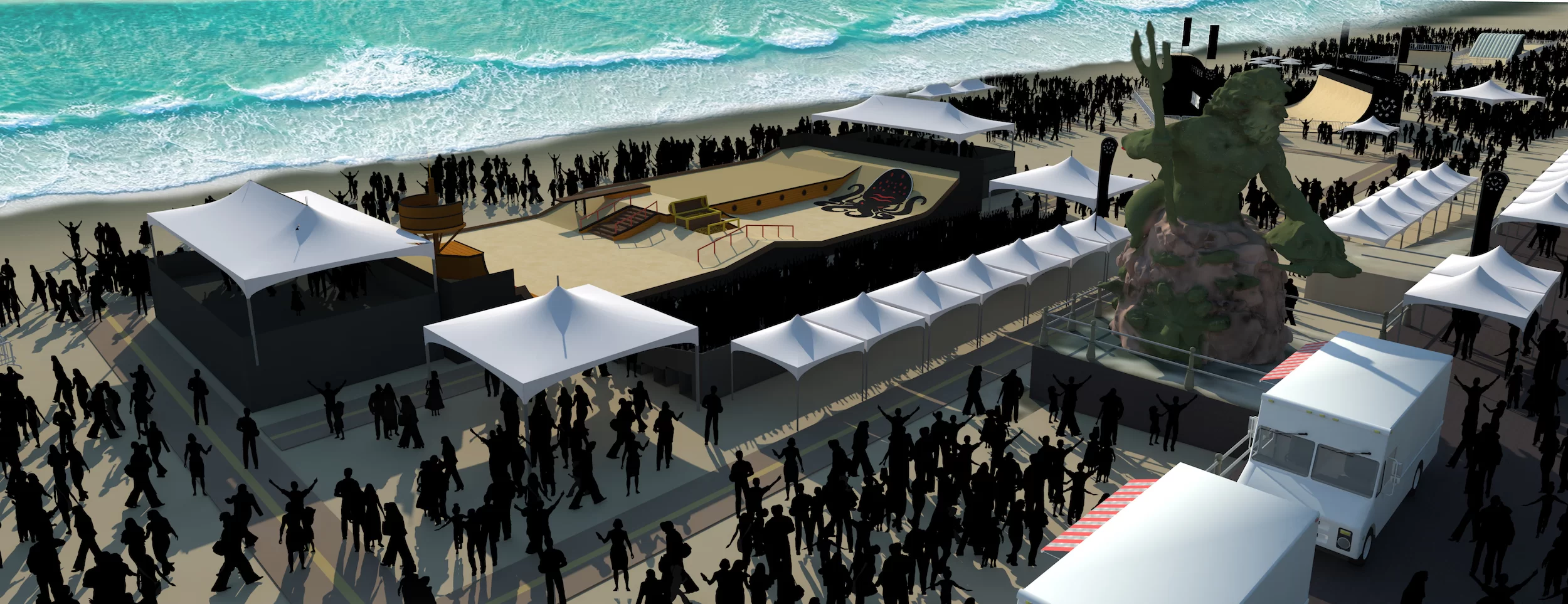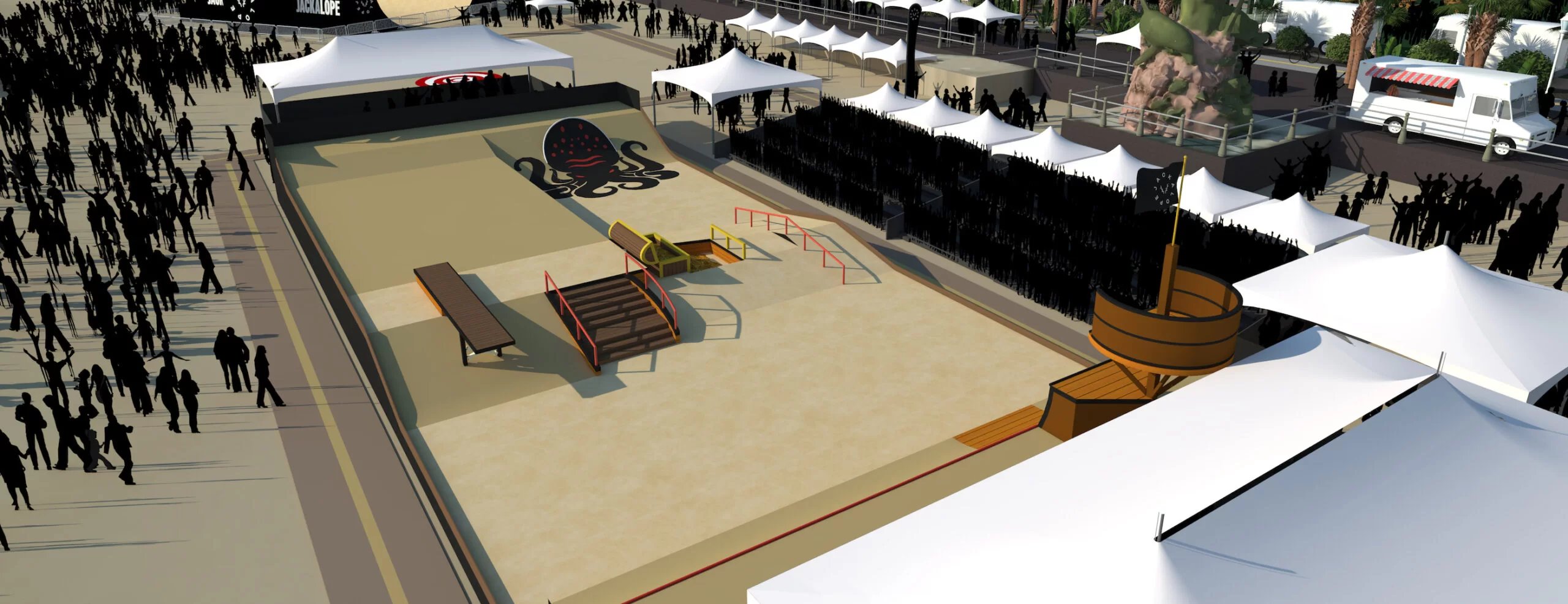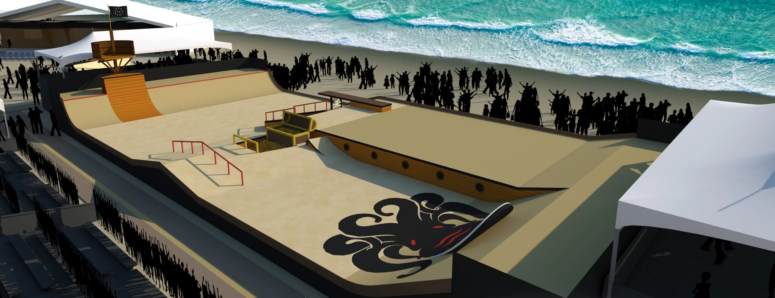 Get ready for our thrilling pirate-themed skatepark adventure! Partnering with California Skateparks ensures an epic show. Renowned for crafting skateparks for top-tier events like the SLS, X Games and Olympics circuit, their expertise guarantees an unforgettable experience. With a concrete ground ensuring optimal performance, every detail has been meticulously planned for an intense ride that’ll push your skills to the limit! It will go hard.